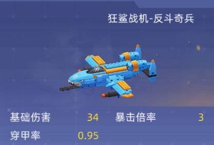 狂鲨战机-反斗奇兵是由积木星球打造的A10“狂鲨”攻击机,拥有专属操作界面,装备“复仇者”加特林机枪并且挂载两枚“响尾蛇”导弹,拥有极高的射速与装弹量,换弹时将飞向基地并且补充弹药并且迅速返航;基础伤害34、暴击倍率3 、穿甲率0.95、 射速100 、跑数0.77、换弹(秒)4、弹夹数100/300、精准70 、生化伤害倍数2它的外观一架仿佛由乐高积木拼接而成的战斗机模型,整体为蓝色,给人的直观感受是比较奇葩怪诞的,但是实则是火力强悍的移动弹药库,拥有离谱的射速和超高的载弹量,可以瞬间现成超强的火力压制!