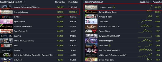 《霍格沃茨之遗》自豪华版解锁以后,热度不断高涨,现已登上Steam热玩榜第二名,仅次于《CSGO》,截至发稿40万人同时在线。