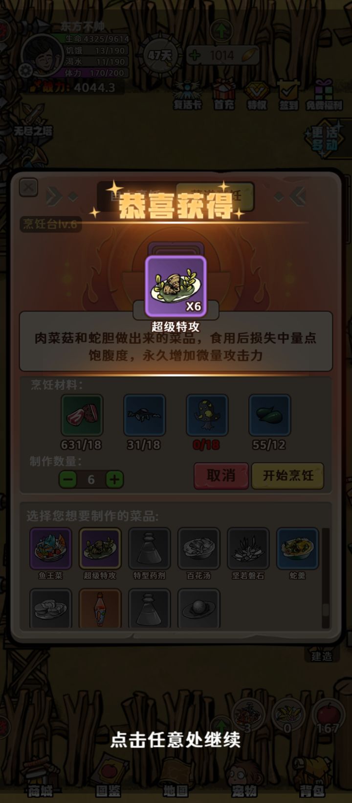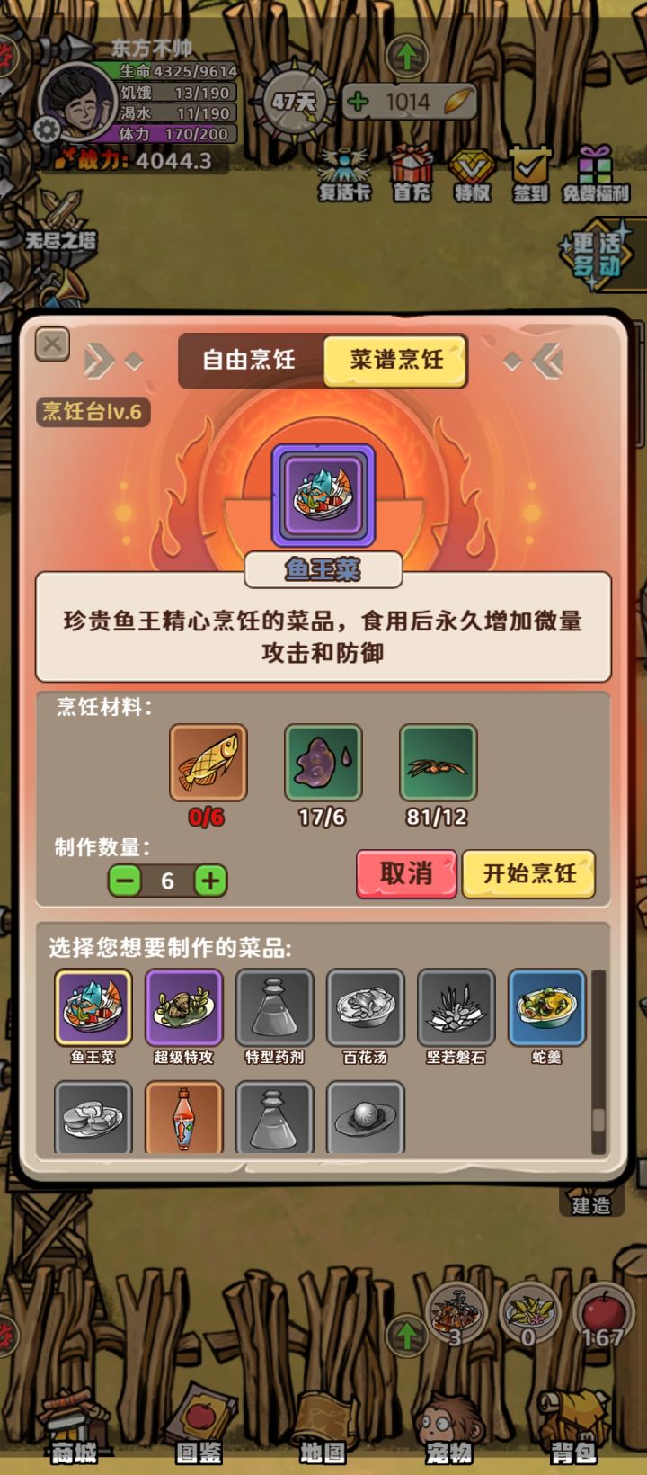 爆肝的就刷东方小岛副本挖矿杀怪砍树咱材料做4级鱼竿(一个鱼竿大概能出5-8条龙鱼)钓龙鱼做鱼王菜(一个3.5左右战力)或者做超级特工(金矿全图副本一次大概可以做2个,1个3.2左右战力),龙鱼在3级鱼场钓,3级鱼场在地图右下角有海豹的地方。钓鱼场要守着才会快速刷新。