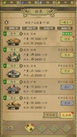 (1) 点击“一键生产”后,系统将根据持有的令牌数量,空闲的武将数量选中今日还有生产次数的产业。