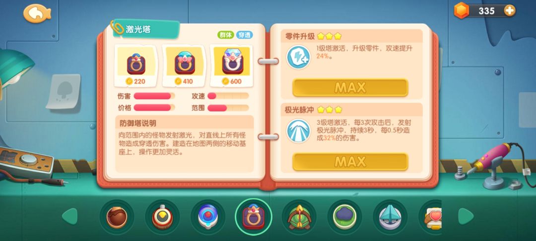 在本关卡内另外两个塔防我觉得不必特意去建,障碍物打出的那些足够了,(附上另外两个塔防技能图片)