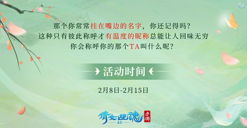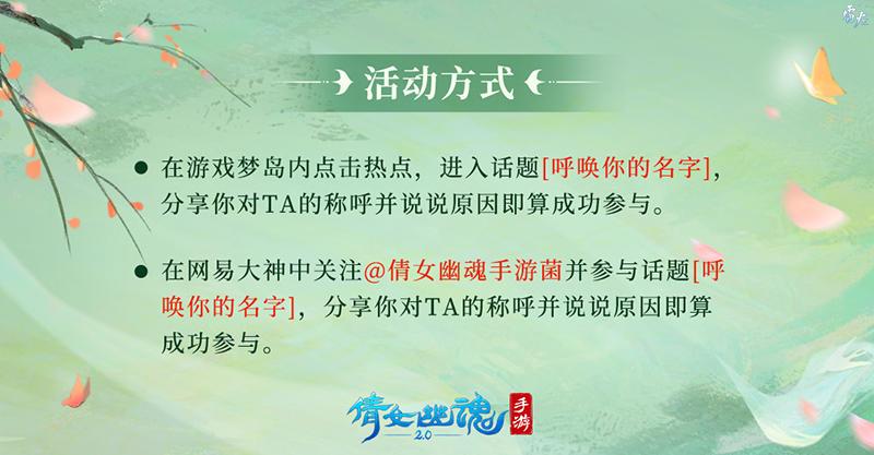 全新活动【呼唤你的名字】浪漫来袭!TA可能是你的侠侣,或是你的结拜,你们也许相伴至今,又或许曾在某个岔路分道扬镳。但TA曾与你朝夕相处、促膝谈心,陪伴你走过一段难忘的岁月。那这个被你常常挂在嘴边、永远率先想起的名字是什么呢?大家的专属昵称可能甜蜜美好,亦或是搞怪有趣,其中定然蕴藏着彼此间一段难以忘怀的小确幸!