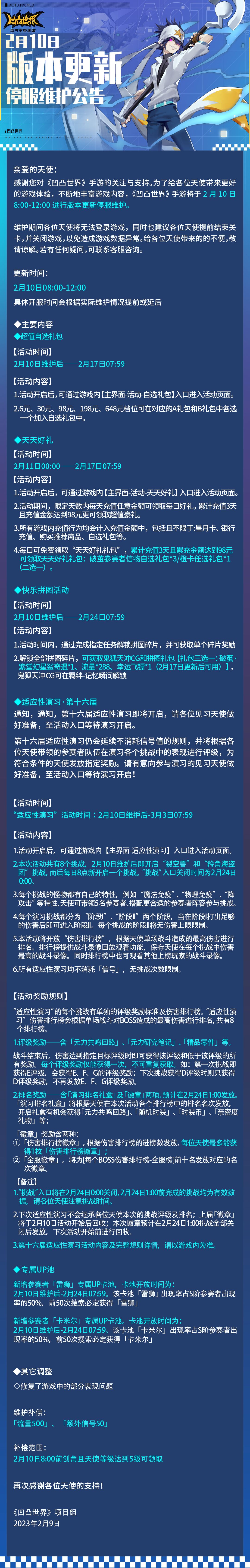 感谢您对《凹凸世界》手游的关注与支持。为了给各位天使带来更好的游戏体验,不断地丰富游戏内容,《凹凸世界》手游将于2月10日8:00-12:00进行版本更新停服维护。