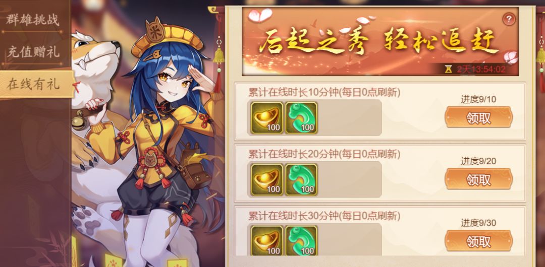 累积在线10分钟:元宝100,功勋100