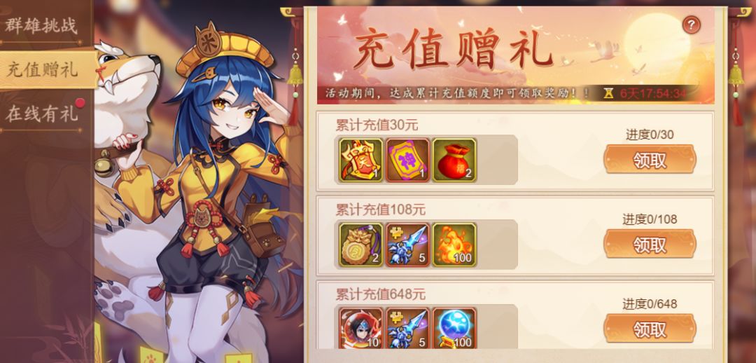活动内容:活动期间,累积充值达到指定额度即可领取奖励。
