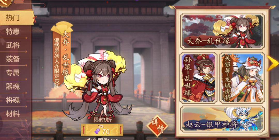 活动内容:活动期间,大乔、孙策、关银屏、赵云系列皮肤限时热卖!