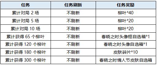 活动期间,完成任务或购买礼包收集柳叶即可兑换精美皮肤、英雄自选箱、春晓福袋等初春好礼,完成柳叶集齐任务后,即可免费领取情人节皮肤自选箱、头像/头像框自选箱等超值福利哟~