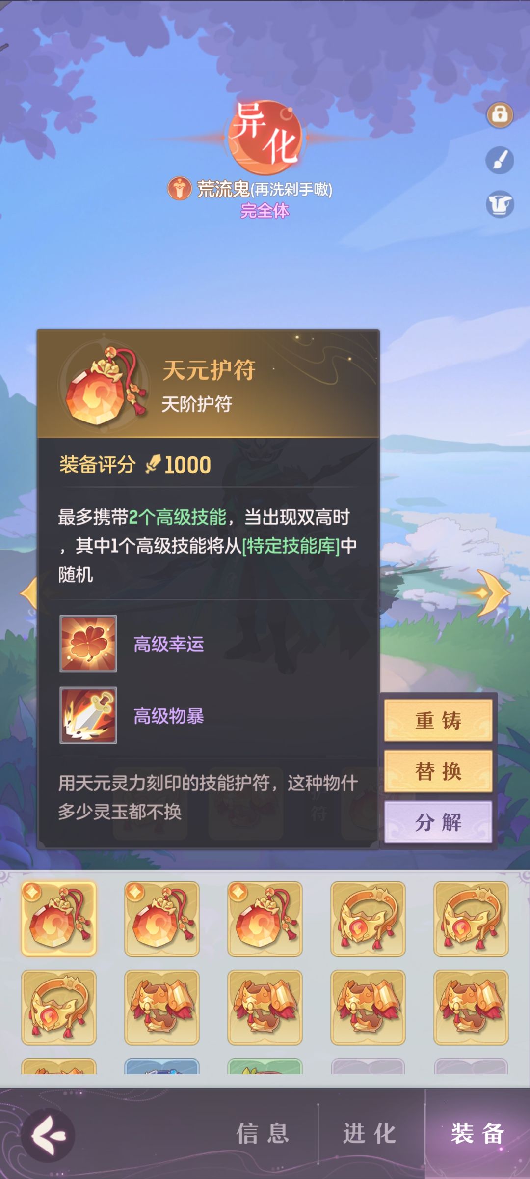 明天就75了,鬼将打书还没什么头绪,目前准备就做一只鬼将,还没开始洗第二只,现有的护符是这三个,需要转火或者雷嘛,已经有耐望月的话这只做暴力流还是耐,兄弟们给点建议