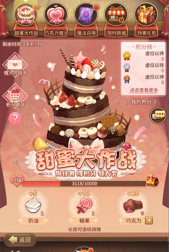 参与【巧克力猎人】活动并完成活跃任务,获取活动道具(奶油/糖果/巧克力),使用道具与全服玩家共同定制情人节蛋糕,即可免费获取积分以自由兑换商城中的珍贵奖赏;