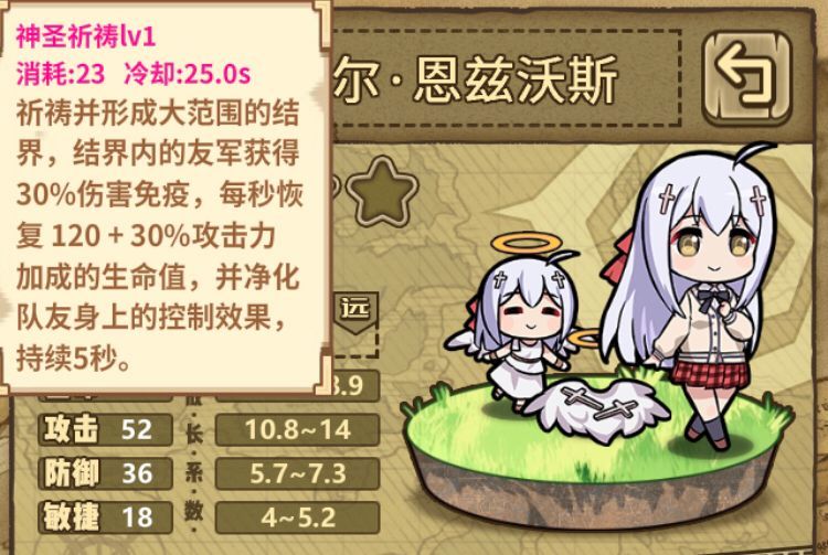 这个四星真不错,有回血有免伤有净化,天马默默的流下了泪水。菈菲尔技能30%/40%/50%的伤害减免,120+30%/40%/50%的范围回血,范围半径大概是对角线的一半,也就是说在小地图基本都能吃到buff,唯一缺点就是自身不免控。