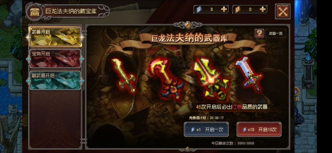 每刷完一张图,它会产出一个抽武器道具,我们攒到十个 再去抽武器,容易出红色武器