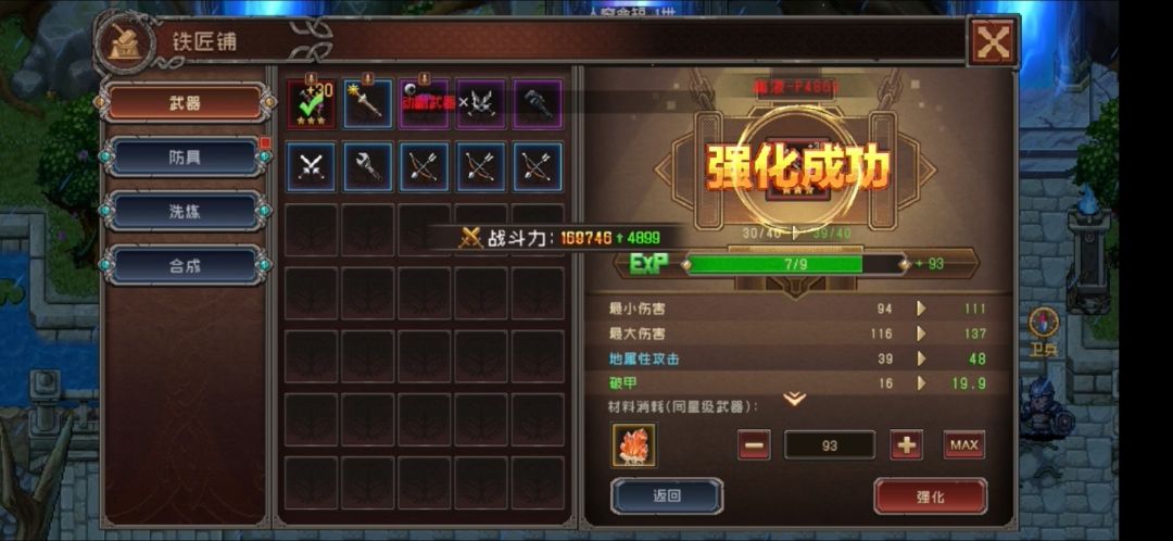 武器可以强化和升星级,星级高有特别的效果。强化只消耗强化石,升星级消耗铜币和武器)