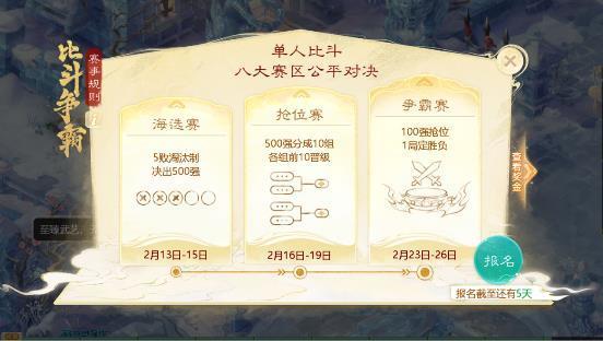 在2月12日大赛报名截止之前,所有已报名参赛的侠士均可重新调整报名所在分组。在报名截止后,2月13日起比赛将正式开打,届时大赛将分为海选赛、抢位赛、争霸赛三大阶段陆续进行。