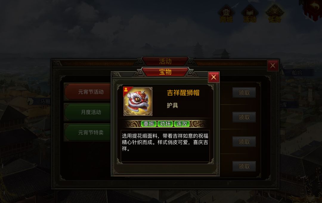 技能描述错误 看护也可以来源 卷毛赤兔马,还有新出宝物 吉祥醒狮帽。