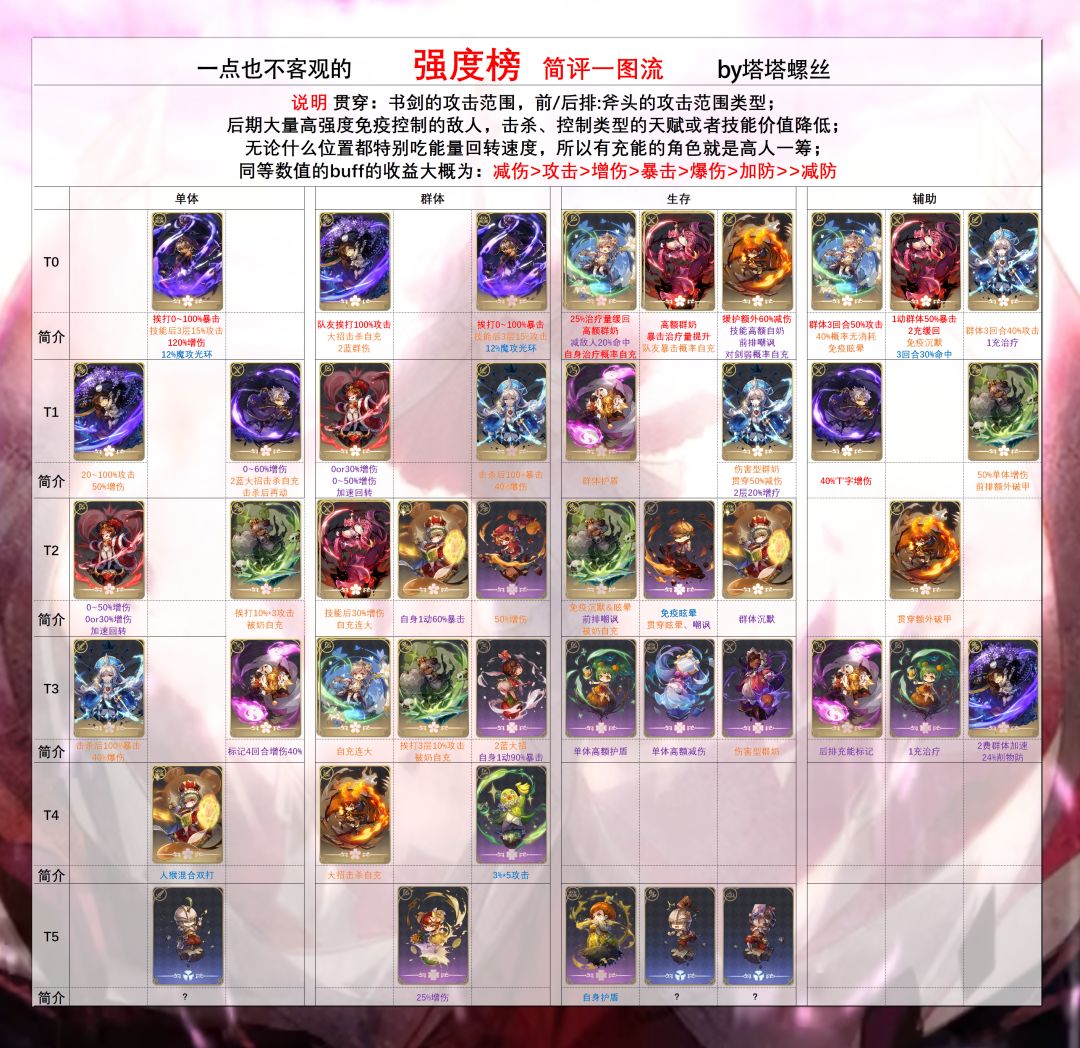 我个人偏向竞速,所以这个榜也是偏向竞速的,考虑的角色基本都是满破至少高破,不过我还专门留了个专门的生存榜给大家参考一下,练度不够的时候可以多使用生存榜里的角色。其中每条属性的颜色代表这个被动在我眼里面的价值,红>橙>紫>蓝