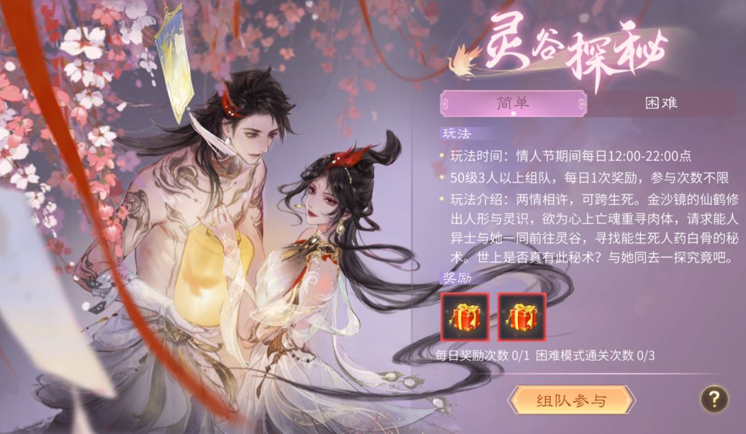 情人节活动期间,每日12时至22时,组队参与灵谷探秘活动,解锁正常结局和隐藏结局便可获得云鹤吟时装(1天)。让菌菌看看谁才是三界第一探秘小天才。