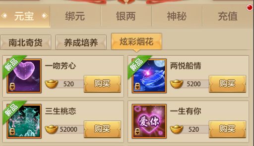 活动期间,商城限时出售“一吻芳心”、“两悦船情”、“三生桃恋”烟花。侠士对好友使用后,自己可获得传情值和碧桃,收礼人可以获得宠爱值,多重奖励详情,下滑看小师妹的收集哦~