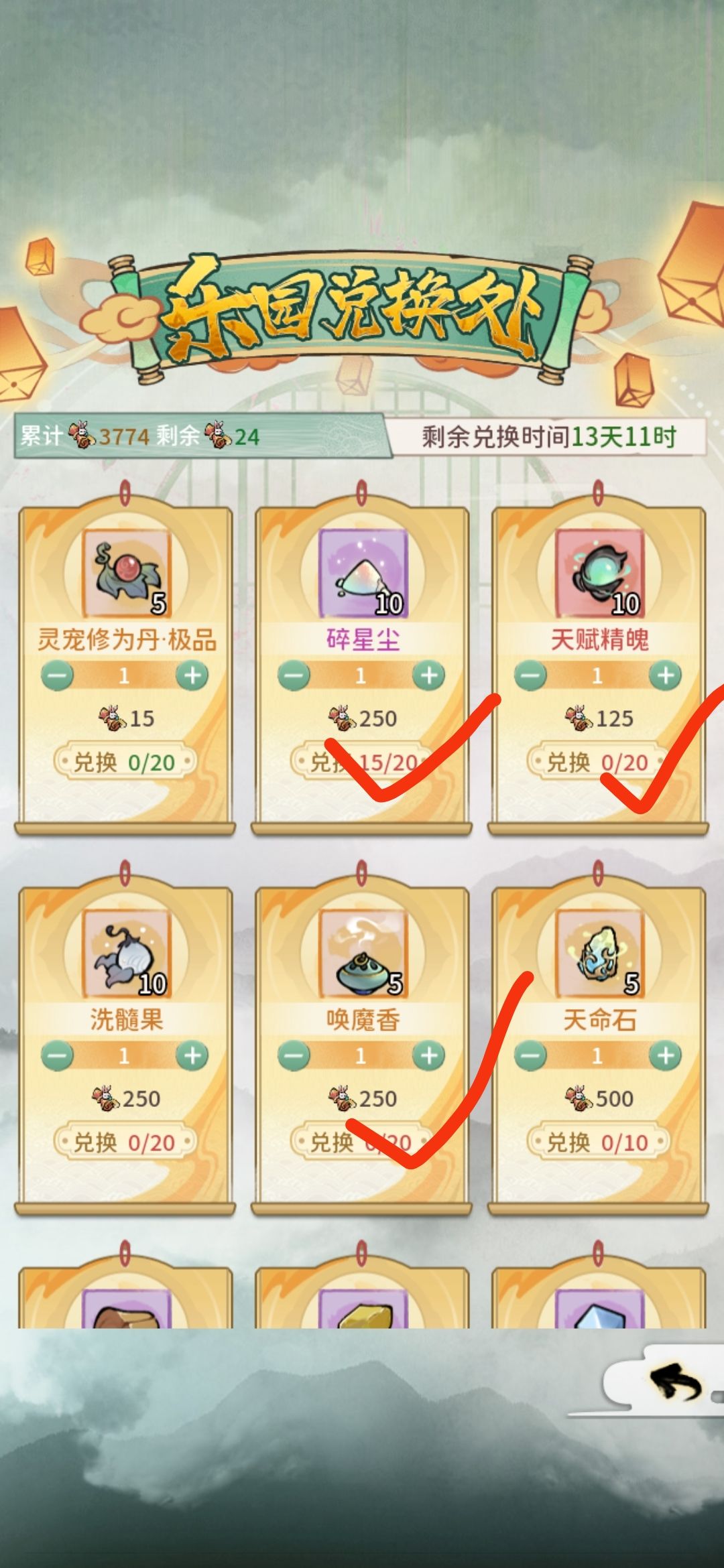 我觉得优先换器灵粉尘,可以换两百,加强化卷足够一个满级器灵,运气好可以有两个,然后就是葫芦,可以抓点神兽,价格也不贵,幻魔香也很便宜,下次神兽秘境也可以搞点肥料去换仙金,最后就是天赋精魄,这东西真的便宜而且如果要养宠物一般都是舍不得用现金直接强化的,这个性价比也是非常高的,最后估计就改换天命的卷轴了,不过挺贵的,换不到就换点别的,探宝石也可以换下次出活动看看能不能嫖到升级武器的材料,可以卖给氪金大佬,可以说这次活动真的挺不错了
