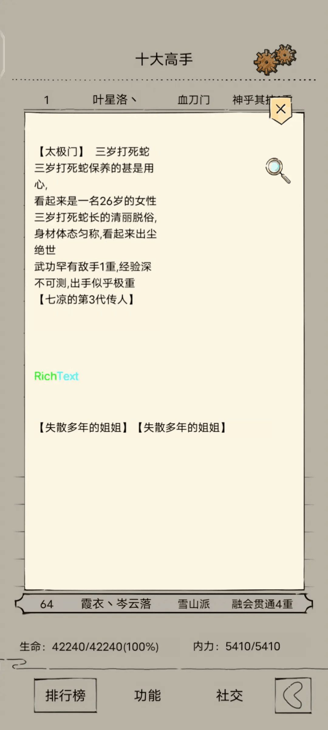 福地凑够10把倚天剑后,对话老乞丐,可以获得仅限福地使用的巨剑,特效是攻击必中,还有倚天剑的缴械效果