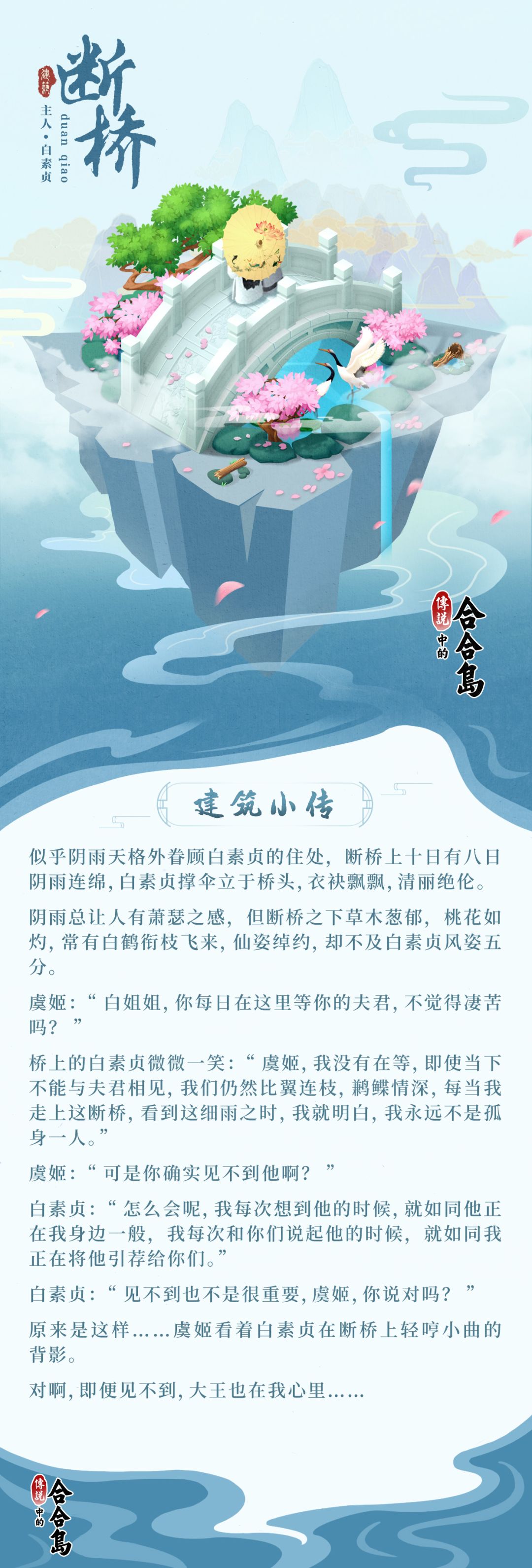 合合匠今天在岛上游玩的时候,听到远处有聊天嬉笑的声音,循着声音过去发现了一座带着鲜花流水的断桥,定晴一看竟是虞姬和白素贞在桥上闲聊,白素贞在向虞姬解释,断桥是当年自己遇见夫君定情的地方。