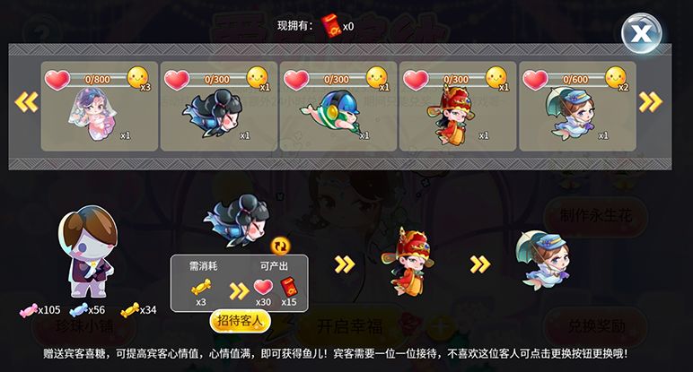 点击下方的<招待客人>,为客人送出它需要的糖果,收获爱心与红包。对应客人的爱心收满后可以领走它哦~