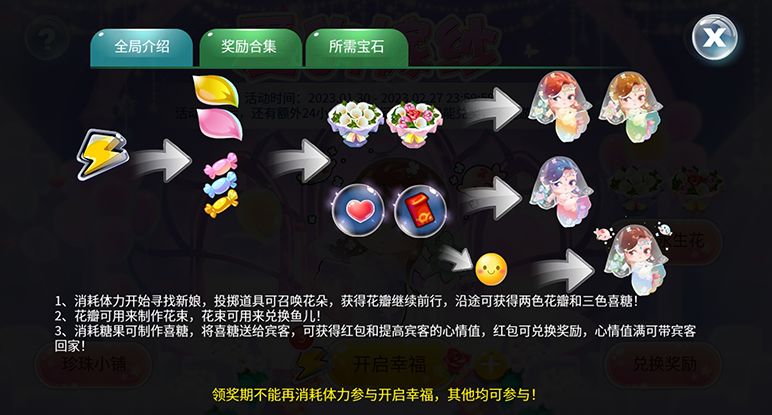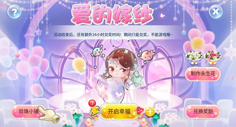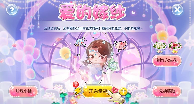 1、本活动分为四部分:开启幸福、珍珠小铺、制作永生花、兑换奖励;