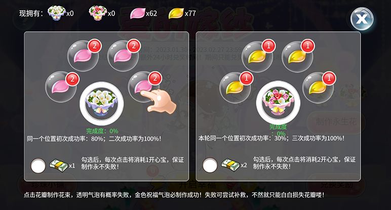 点击花瓣制作,透明气泡有概率失败,当气泡为金色必定成功,获得的永生花积分就可以到<兑换奖励 >中领奖啦~