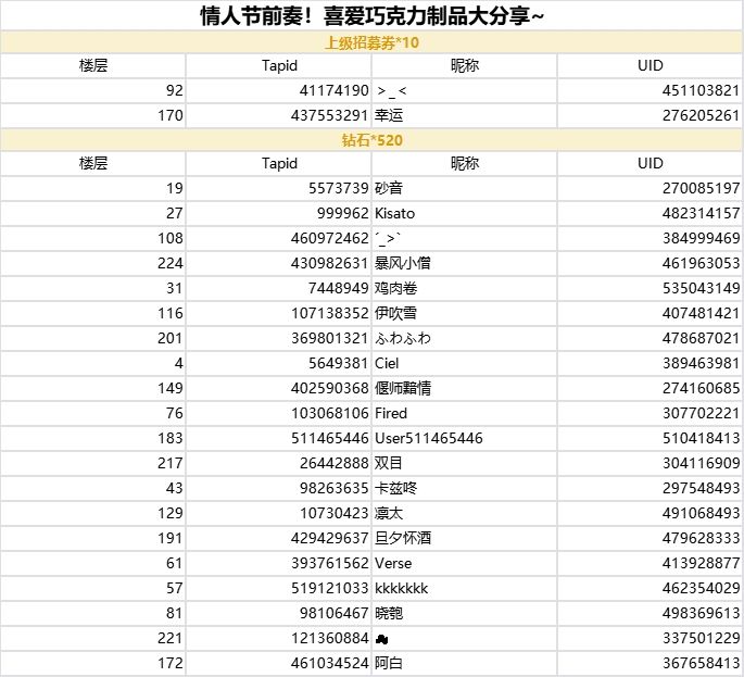 制作人们久等啦,让我们恭喜以下幸运的制作人们!奖励会在7个工作日内发放到制作人的礼物盒中,请注意查收~!