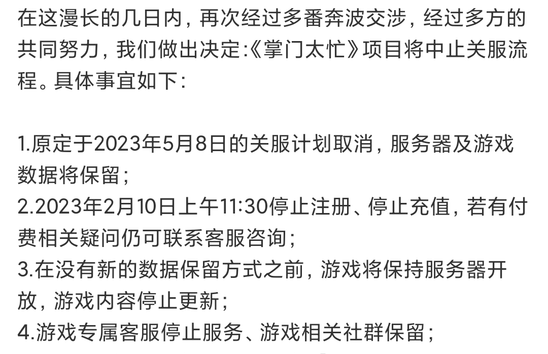 游戏将“保留玩家数据,停止充值,停止更新,停止新用户注册。在单机版或者离线版上之前保持服务器开放”。