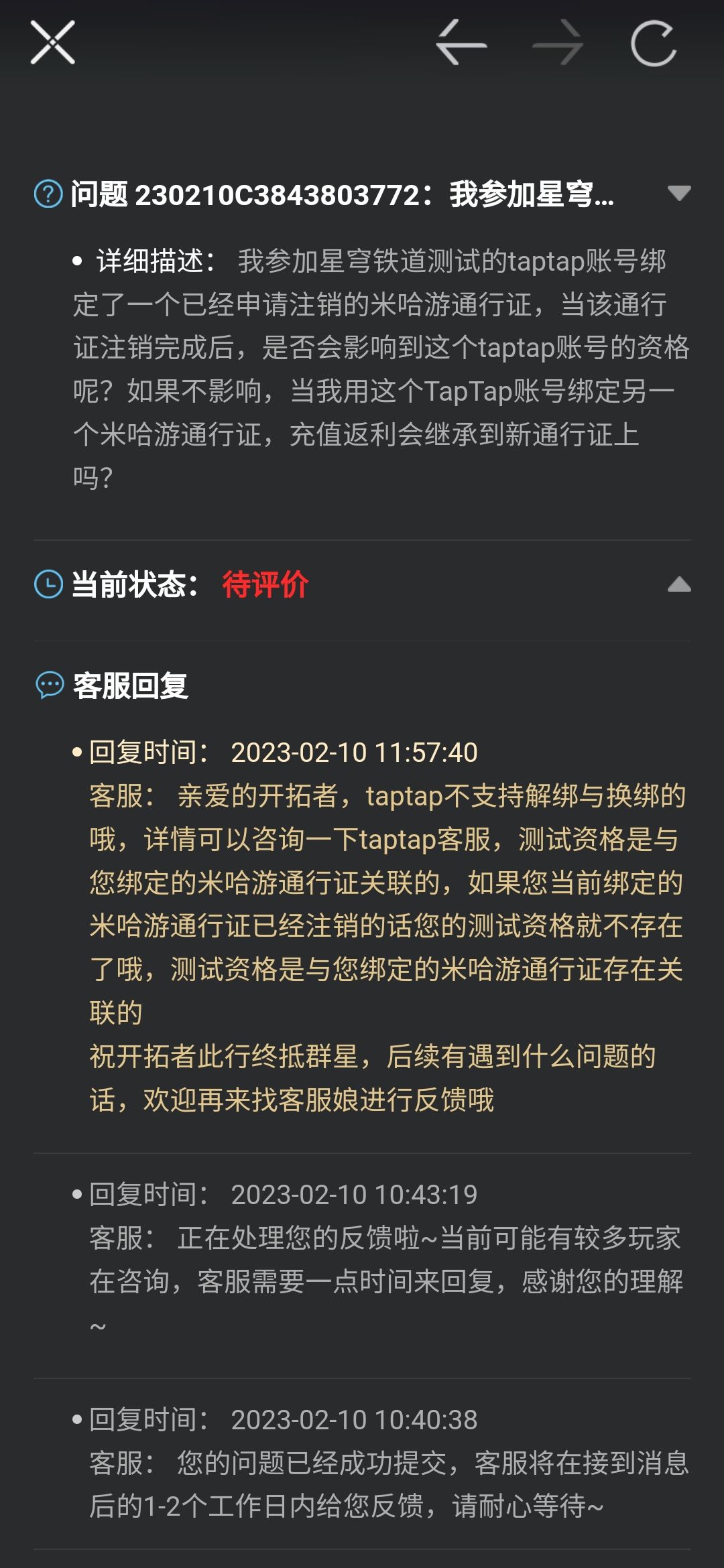 ①获取资格的TapTap账号之前绑定了一个米哈游通行证:这种情况的话,测试资格自动绑定这个米哈游通行证而不是TapTap账号,如果获取资格后TapTap绑定的米哈游通行证注销,那么测试资格也一并消失,有图为证