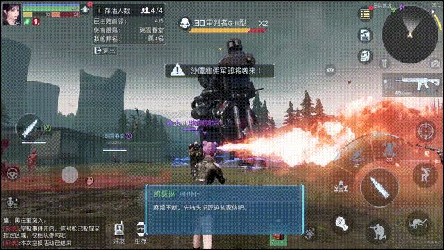 打败了武装直升机后,就来了十三区的重重重头戏:机甲。审判者G-Ⅱ型机甲是《黎明觉醒:生机》当中的主要作战类机甲,攻击方式有导弹、机枪和火焰喷射,虽然机甲的火力十分凶猛,但攻击范围有限,存在攻击死角,这也是击败机甲的关键点。