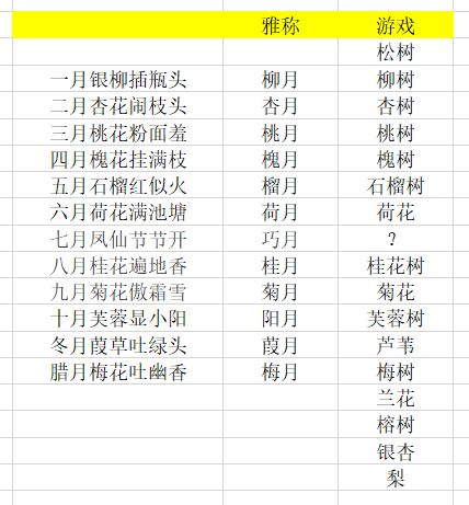 在游戏里能建造的13种植物里,除了初始的松树外,其它12种,是专门对照12个月份雅称做设计的。