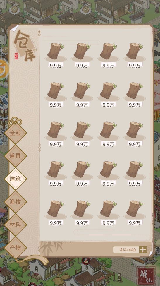 卖树(材料)的过程中,千万要看清,别把最后那三种稀有材料(竹干、梨花木、银杏木)卖了。这三种,可是妥妥的稀有资源,从开局到养老,一直都是稀缺资源,掉落方式单一,且缓慢,基本都是靠银子来买礼包救急。