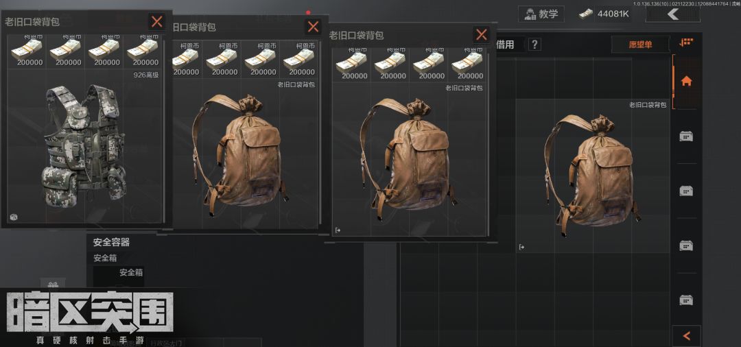 作为屯屯鼠的我,就喜欢把钱留着等着用,结果越存越多,官方的仓库容具又是有数量限制的,经过对比,目前得出最能叠加空间的方案,首先,需要准备三个老旧口袋背包和一个926高级弹挂或者B6战术弹挂,因为背包做多能叠加三个,老旧背包是占有4*4的空间,也就是16格,但是背包空间是4*5,有20格,弹挂为什么选926高级,因为对比后,只有926(4*4格,24容量)高级弹挂和B6战术弹挂(3*4格,20容量)是最能节省空间,依次将背包叠加,然后将弹挂放在最里面的一个背包,再把钱放进去,这样弹挂24容量+4(最里面的3号背包去除弹挂占用格数剩余)+4(中间2号背包去除3号背包的占用格数)+4(2号背包占用最外面1号背包的格数)=36容量,也就是说,这样1号背包占用仓库4*4=16格,但是有36背包容量,变相的增加了仓库20格,要知道一个最大的仓库容具才7*10,只要这样的4个1号背包,就能多一个空间仓库了,多划算,你们还有比这更加省空间的方案吗?