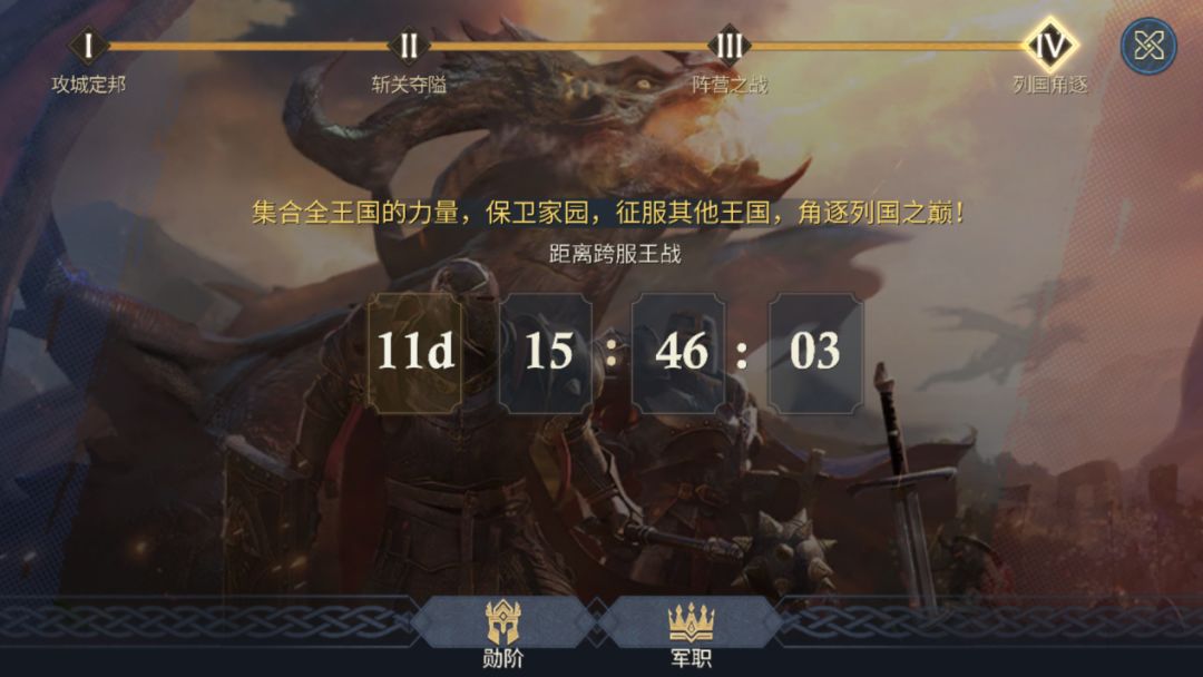 入关成功之后将会开启阵营之战,全服的联盟将会分为拥王军和卫国军两个阵营,同时解锁军职系统,阵营领主通过完成军职任务获得军工晋升军职。