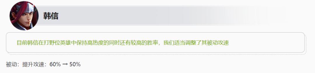 在2月9日的版本更新中,韩信被降低了被动的攻速,攻速加成从60%变成了50%。