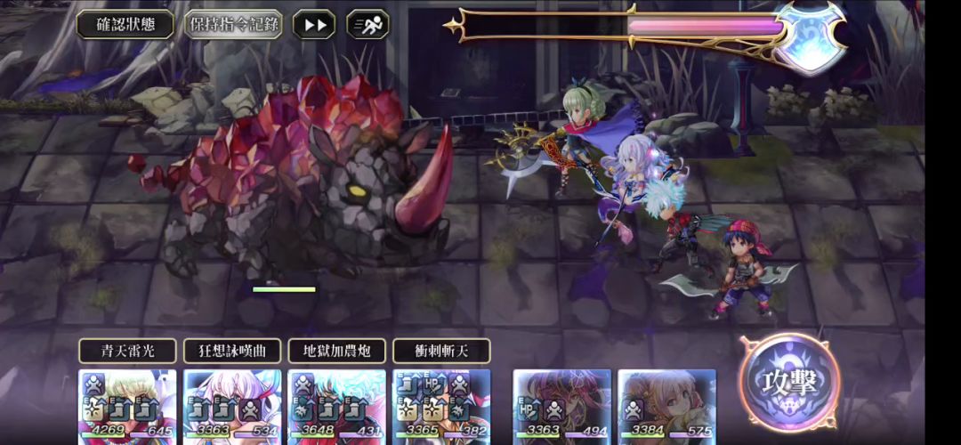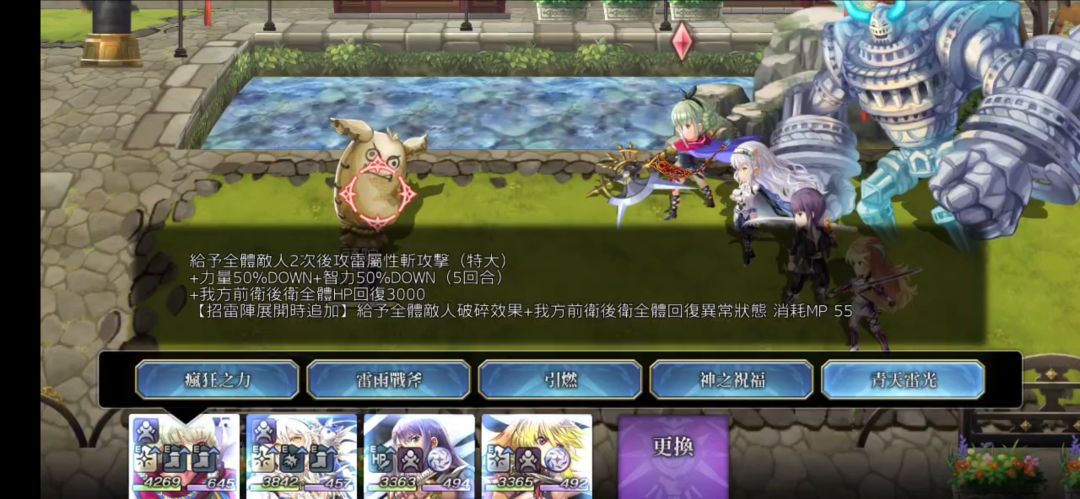 【青天雷光】可以一键达成:力量、智力50%DOWN+恢复前后卫3000HP+全体破碎+解异常