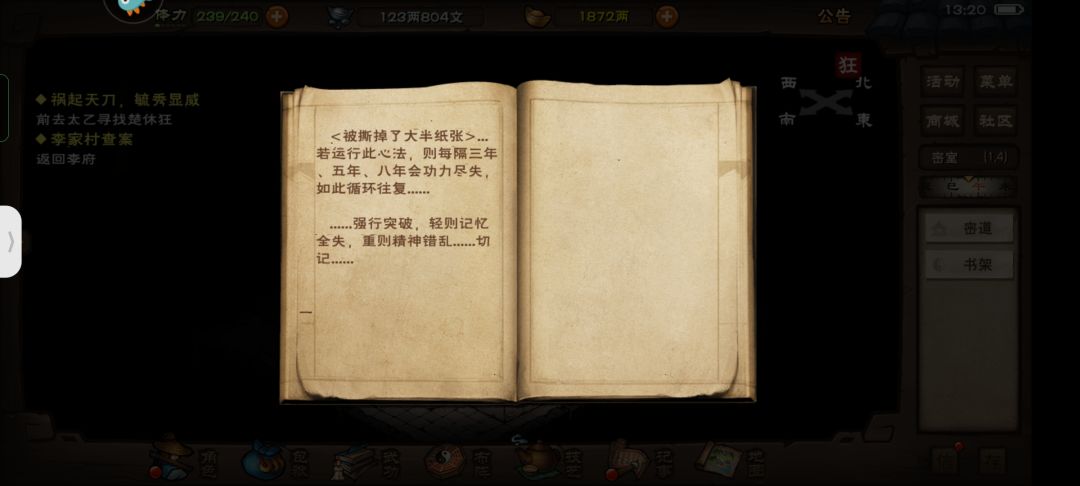 月蓉身世任务,这攻略有问题,只要跟着任务走搜索偏殿就有道袍,不喝茶不被迷晕,才有隐藏剧情,后面选和盘托出质问孤鸿,打一架,孤鸿会黄泉剑法非常垃圾,差不多两万血,后面被天字杀手偷袭杀了,选择救人也是死,然后说了些含糊其辞的东西挖坑,选择追问,我都冥使了这天字杀手让我不要多管闲事,后面人就走了,发簪插入剑鞘开启暗室内幕日记都写清楚了,婆婆(一个写日记的人)实际只是称呼不是年龄上的婆婆,早上月蓉受不了这刺激去暗室呆了十分钟后,再下去对话说要销毁功法(本来就是残的不能再残的残本了),然后就没了,还有一间房没开应该是个坑,婆婆日记写的把她情郎师哥推下悬崖了,觉得他死了,按套路来说应该是没死,期待后续