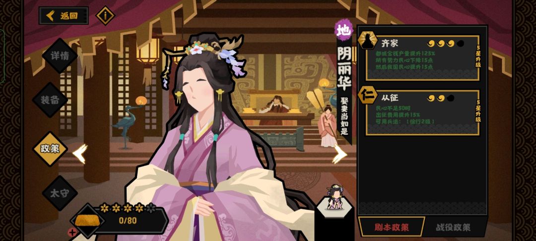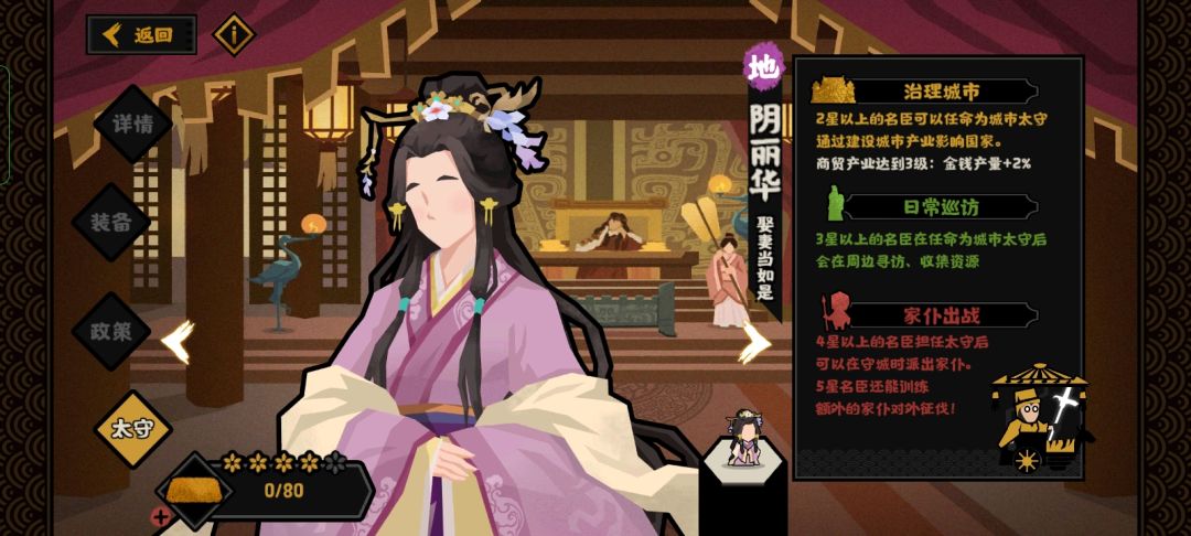 金钱可以用齐家和阴丽华的太守技来保持正收益。(都城多建商贸产业)