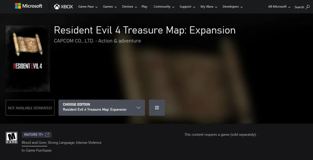 在Xbox商店中可以看到《生化危机4:重制版》的藏宝图DLC,为游戏提供全新的宝藏收集品。购买藏品图资料片之后,在游戏世界中就会出现多处财宝。而部分财宝是只有在购买这款藏宝图资料片之后才可获得的。