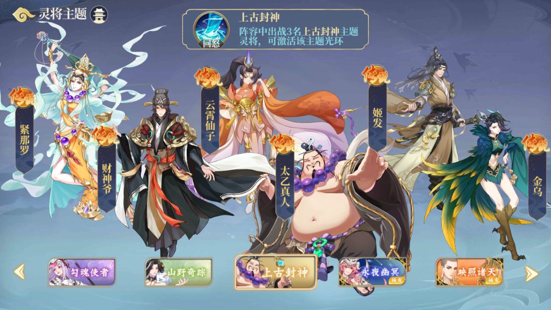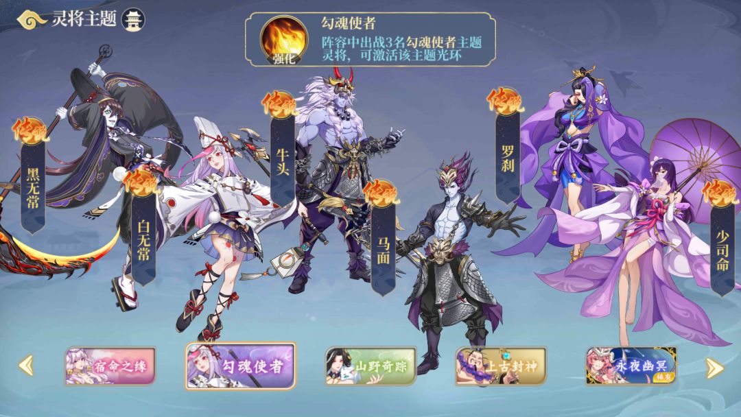 这组主题从名字就可以感受到其名字带来的压迫感,开战时3名同主题灵将上场,会同时吸收3层“冥府”,每一层都可以提供减伤,击杀目标时触发冥府技能,最多可叠加三次,达到压制对方灵将的效果,其中阎罗王可谓是本场主题的C位选手,这都要归功于他起死回生的必杀技,阎罗王在团战中若不幸陨灭,则会满血复活,并在复活时触发必杀技,使对面灵将无力回天