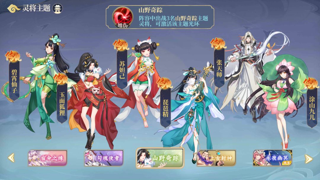 是的,你没有看错,该主题可谓是美女如云,最争奇斗艳的一组!张天师在其中倒是显得独树一帜了,但是你可别小巧了这些女性角色哟,封妖路漫漫,必然少不了各路美女辅助的支援呀。其中苏妲己作为后排的最佳刺客可以滴水不漏的迅速清扫战场,快速结束战斗,成为排兵布阵中的重要一员。且当该主题中有三名英雄上场时,所有英雄在使用完必杀技之后,所有灵将将获得强化,且提高伤害