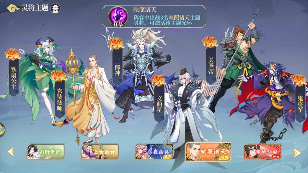 这组主题的霸气程度和他的名字一样,每一个灵将单拎出来都是以一敌五的至尊王者,该组主题中任意三名灵将上场,可在战斗中立即获得怒气值,造成的普通伤害立刻变成致命伤害,若击败对方灵将则会刷新怒气值且增长持续时间直到结束对战,该组灵将每一个都是所属领域的佼佼者。二郎真君作为天界神将,自然在技能方面有不同于其他灵将的过人之处,同样在团战中作为最重要的前排位,杨戬在承担肉盾的同时,也是超高的物理输出,在对方灵将处于残血状态时可快速移动至灵将后方,收割战场
