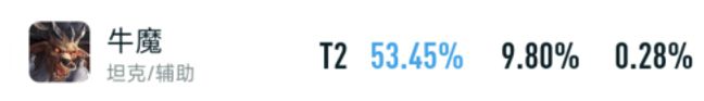 目前新赛季已经过去了一个月,牛魔在出场率逼近10%的情况下,胜率居然保持在53%以上,睥睨东皇太一,力压桑启苏烈,不愧是新赛季的辅助上分最大黑马。