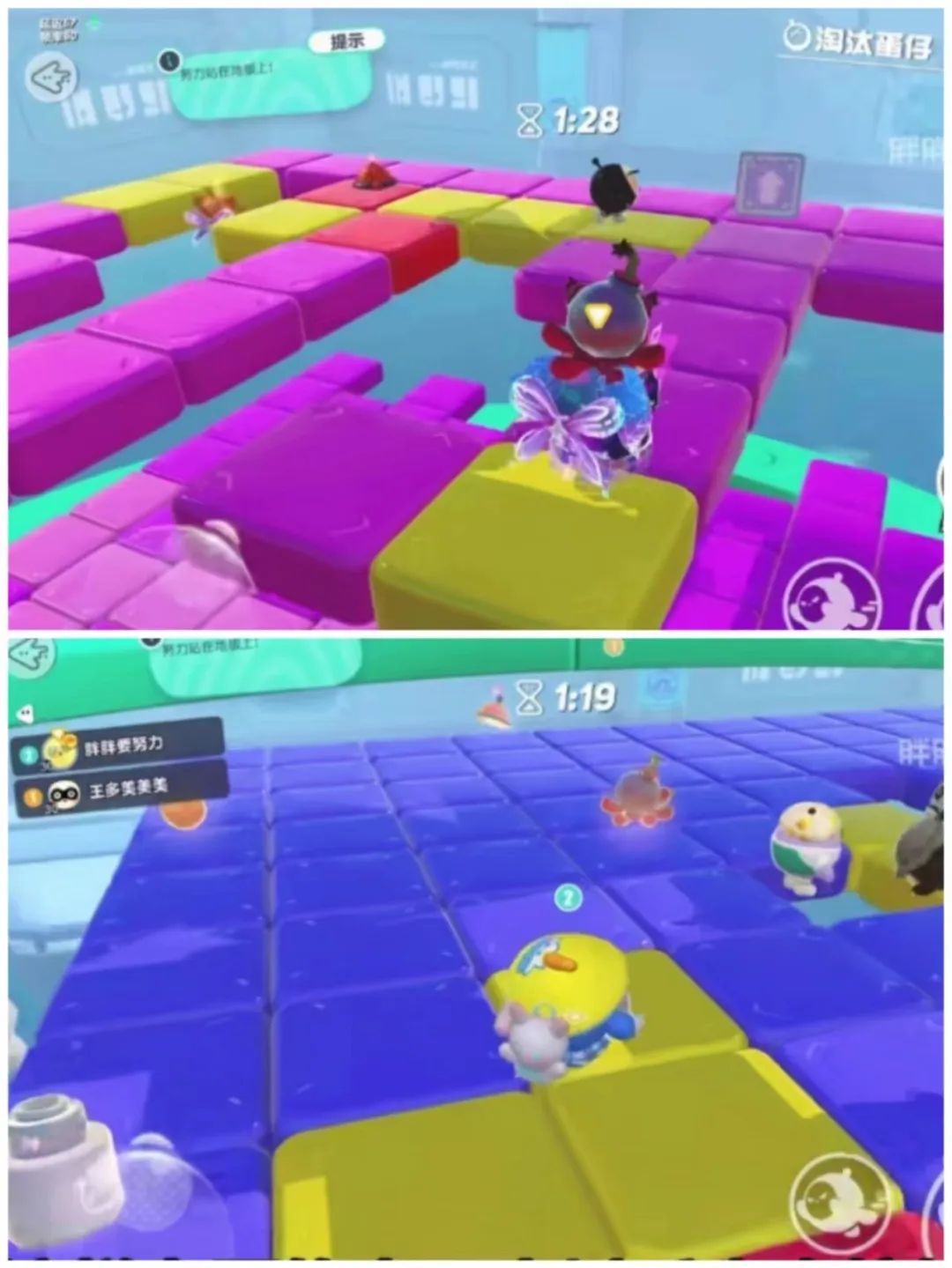 记忆旋律:记忆旋律中的大屏保会出现多个颜色,所在地板颜色也会随之错乱变换,这就考验蛋仔们的记忆了,要站在正确颜色的地板上,如果站错了地板可是会被淘汰的。