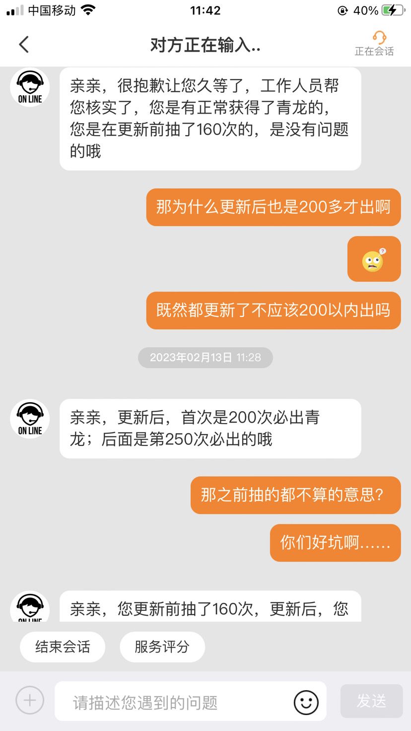 他不是说200发保底吗,205发没出我就找客服了,然后第二天出了客服查了是220发一直说是正常获得。不过我玩这么久游戏理解的200保底不是200必出吗