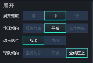 阵型需要控球权,所以展开方面,速度设置为中。424并不是完全依赖边路突破,所以传球倾向为平衡,球员站位为战术,更便于打配合。由于这个阵型追求极致的进攻,所以球队倾向为全线压上。
