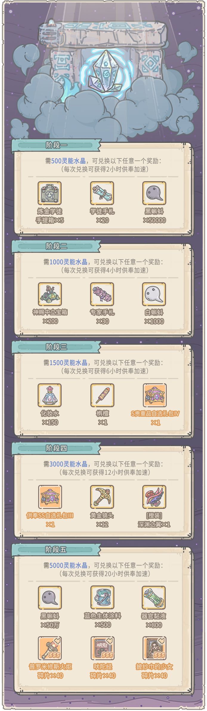 活动期间,消耗供奉加速(小时),可获得以下奖励: