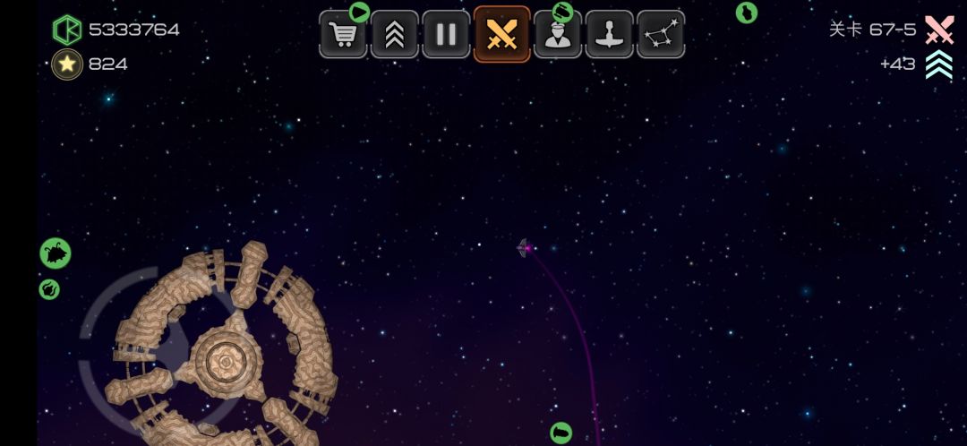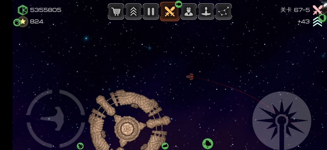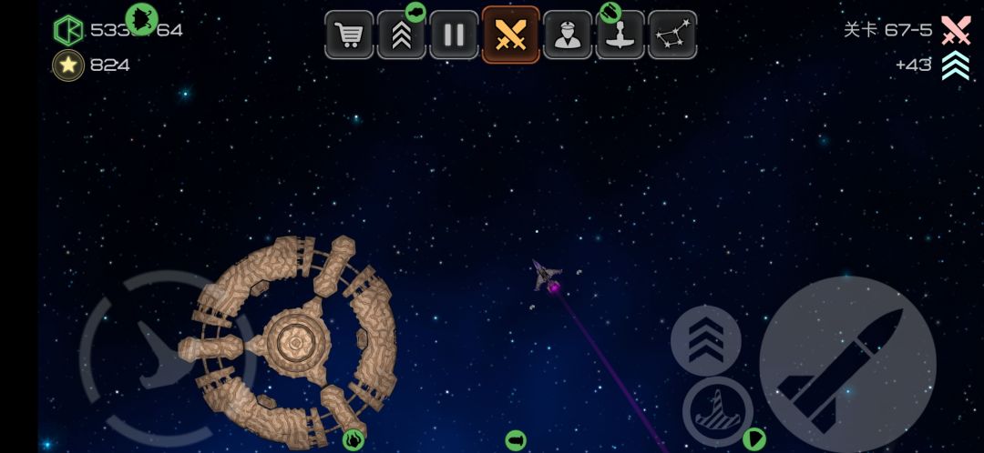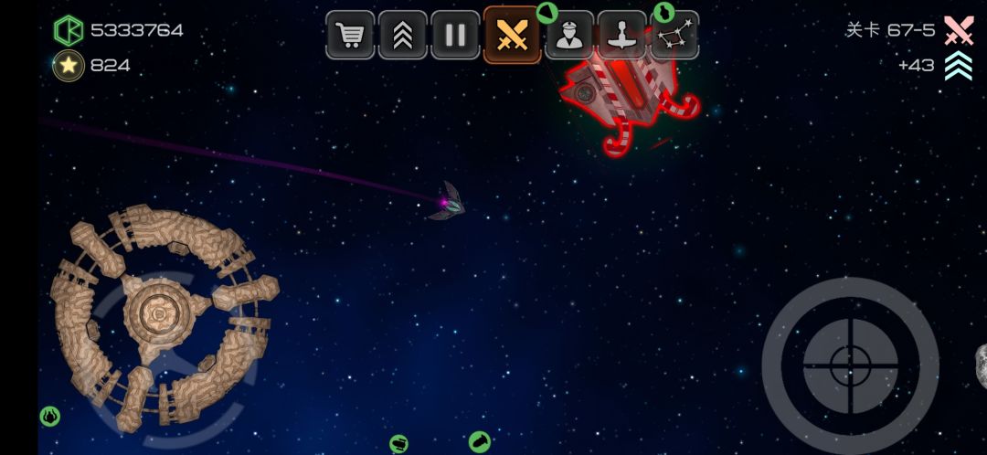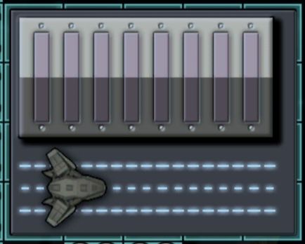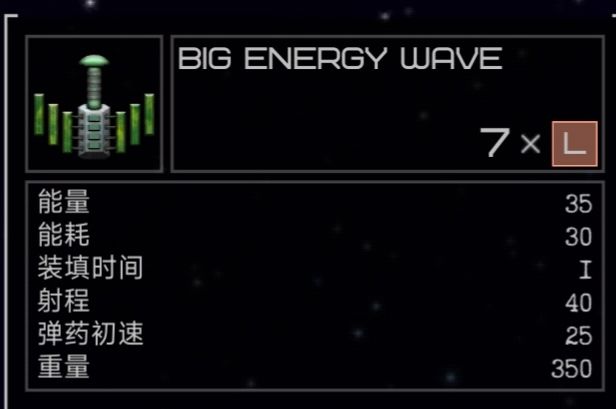 4格L槽武器,攻击方式为向前方发射一道能量波,波的范围逐渐扩大,速度与飞船速度成正比,被能量波打到会停顿一小段时间。
