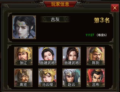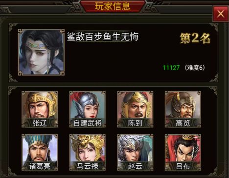 在这次合肥之战中,带领 张辽、陈到、高览、马云禄、赵云、吕布和两位自建武将拿到了第三的好成绩。